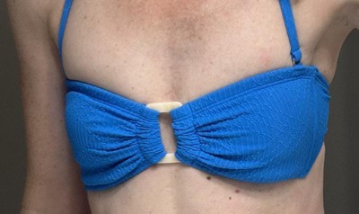 I struggled to find something to enjoy about this bikini top. I was excited for a bright blue top to wear to the pool, the beach, and maybe while working out when it's miserably hot. First, the padding in it is abysmal. The pads are so large and don't fit correctly. It felt so awkward when I first put it on, then found out the pads were curling in and folding on themselves because there isn't proper space. It's like someone took a C cup pad and shoved it into a B cup. I took a picture to show how much bigger the pad is vs the space. No matter how I pulled or adjusted the pieces in the cup lining, they continued to curl and fold. Once I took them out, it fit better and the top wasn't as tight. Still tight but not uncomfortably so, like with the pads. Second, the vertical pieces at each side that help give it shape and keep it upright are somewhat stabby. You can see in the pictures that they really stand out. The bikini top looks small from the front but the side angle is awkward because those vertical pieces stretch out the sides of the bikini (so bikini across the chest looks small but then looks wide at the sides). Those long vertical pieces are quite pointed, jabbing in at both ends. This is an all around uncomfortable bikini top. With or without the padding. It's uncomfortable and looks awkward.