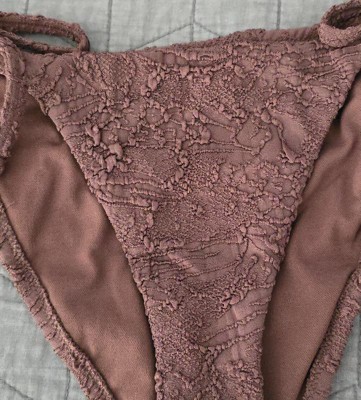 I like the design on these. They're brown with a pretty abstract woven design all over. It's subtle, but nice. They're adjustable with the strings, and it stays in place. I feel the coverage is good and I feel comfortable that everything stays in place with these bottoms.