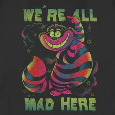 Hop down the rabbit hole and through Tulgey Wood to find your favorite new officially licensed Disney Alice in Wonderland Rainbow Cheshire Women's T-Shirt! This colorful distressed design features Cheshire Cat pointing at "We're all mad here" printed around him in green wavy lettering and a smoky background full of stars and sparkles. You'll be "Mad as a Hatter" if you skip out on this tee, so grab one today!