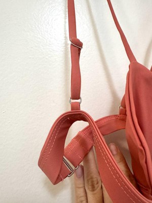 I love this style of bralette swim top! The straps are adjustable as well as the band. The construction on this top seems like it will hold up good. This is a pretty muted coral color with silver hardware. Can’t wait to wear it during the summer!
