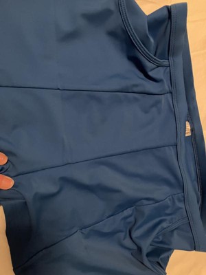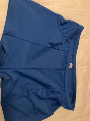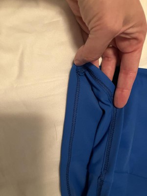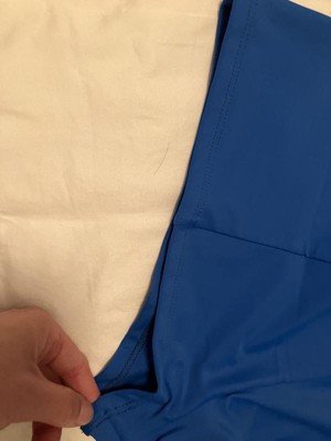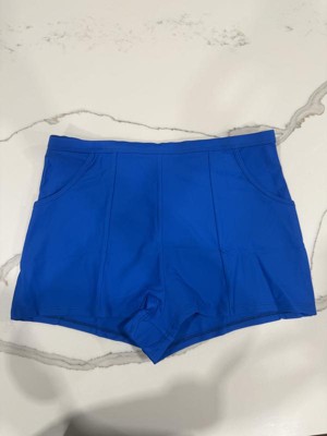 Very cute shorts. The color is a nice blue. Material is thick, so no seeing through. Ladies, it even has pockets! Full cheek coverage. Stretchy, comfortable material. Doesn’t look like it will fade much from sun or chlorine either.