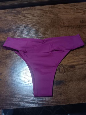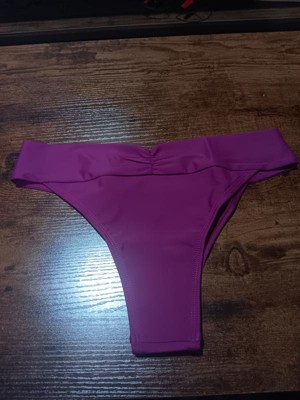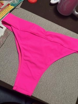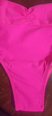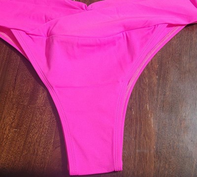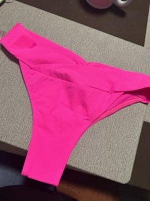 This bikini bottom is cute and I really wanted to love it, I really did. But I did not. The little design and roughing of the fabric on the bikez and pleat infront adds flair and embellishes the bikini bottom, but that's where the good stops for me. I was hoping the material would be stretchier and have a little bit more give - but it doesn't. Making it difficult for me anyway, to feel moving freely was possible. The cut is a little higher than I personally like for me, especially the front hip area. The sizing was a little snug and not so true to size. Not very flattering- again for me, and my personal preference. I do however LOVE the color. It's a great shade of hot hot pink.