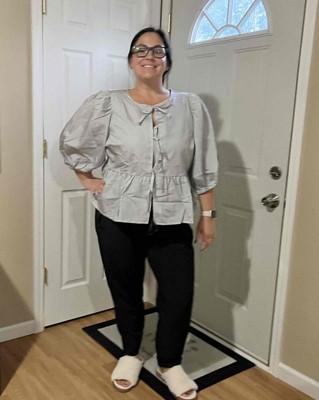 [This review was collected as part of a promotion.] This balloon three quarter sleeve shirt by A New Day is interesting. The material is a standard cotton and definitely needs a good pressing right out of the package. The sleeves are billowy and fit the “balloon” definition. But the front is held together by three true tie closures. Mine had a decent size gap that surprised me. I suppose I could tie them tighter. But be warned that you will need something underneath. I am wearing a size small. I received an incentive to write this review.