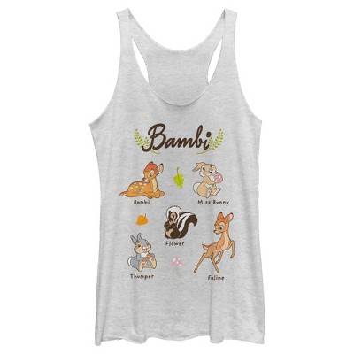 • Strut your stuff with this stylish new women's racerback tank top that is perfect for heading out into the forest! Featuring six of the main characters ofBambiwith their names written underneath, including Bambi, Faline, Miss Bunny, Thumper, and Flower across the front.