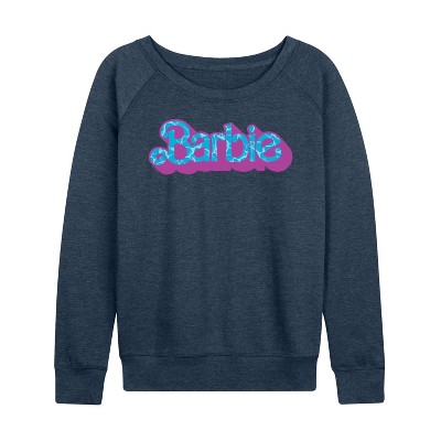 Women's Barbie Gradient Palm Tree B Logo Lightweight French Terry Wide Neck Long Sleeve Graphic Shirt - Heather Indigo - Large