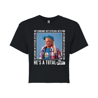 Barbie - Hes A Total Ken Group - Juniors Cropped Graphic T-Shirt - Step into the glamorous pink world of Barbie with our officially licensed graphic garments for the fashion-forward! Whether you dream of being a fashion designer, a mermaid princess, or a world-traveling explorer, our garments bring Barbie's world to life with vibrant colors and playful prints. Crafted with quality materials and attention to detail, each piece ensures comfort and durability for all-day play. Express your unique sense of style and imagination with our exclusive Barbie graphic apparel!