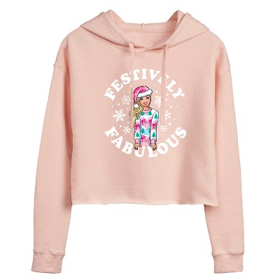 Barbie - 'Tis The Season - Juniors Cropped Pullover Hoodie - Step into the glamorous pink world of Barbie with our officially licensed graphic garments for the fashion-forward! Whether you dream of being a fashion designer, a mermaid princess, or a world-traveling explorer, our garments bring Barbie's world to life with vibrant colors and playful prints. Crafted with quality materials and attention to detail, each piece ensures comfort and durability for all-day play. Express your unique sense of style and imagination with our exclusive Barbie graphic apparel!