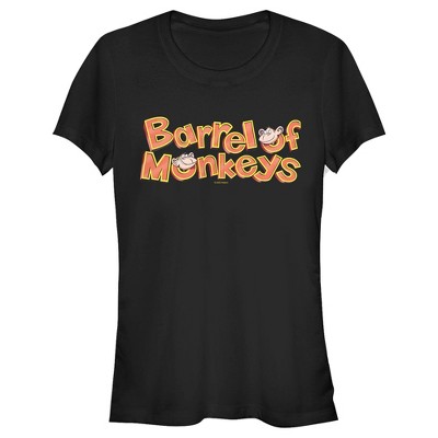 Get ready to monkey around! Let your style reflect your festive spirit with this new officially licensed Hasbro Barrel of Monkeys Ugly Christmas Sweater Print Women's Graphic T-Shirt! This holiday-themed tee features a colorful ugly Christmas sweater pattern with snowflakes, red, blue, and green barrels, monkeys, and the classic game logo. Celebrate your love for this timeless Hasbro game and add coziness to your wardrobe with this awesome apparel ideal for the Christmas season!