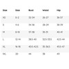 | Size | Size Range | Bust | Waist | Hip |