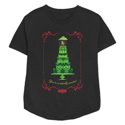 • Strut your stuff with this stylish new women's straight fit t-shirt that is perfect for every occasion! Featuring the iconic wedding cake of Beetlejuice and Lydia Deetz, along with the message: "You're Cordially Invited," all within a red frame across the front.