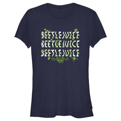 • Strut your stuff with this stylish new women's t-shirt that is perfect for every occasion! Featuring the word "Beetlejuice" printed and repeated three times across the front, along with bats, skulls, bugs, and spiders.