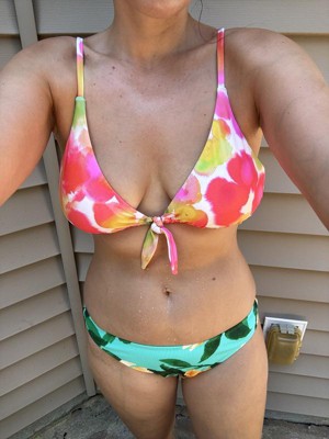 This swim top is so cute and I do love the shade & shore brand. The little faux tie detail in the front and the almost watercolor looking print were my favorite parts. I would caution people with bigger chests to be careful and I would say for all people this is not a top made for any kind of activity. I felt like the back knot was not secure. Last note, and this may seem over the top, but this print is one where you might be better going to the store to pick it out. If you compare my photo to the stock photo, you can see the how the color mix is quite different.