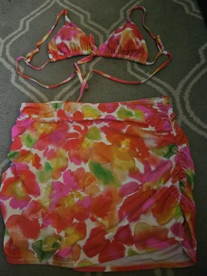 The adjustable strap and adjustable back-tie closure make it incredibly easy to get the perfect fit, ensuring just the right amount of coverage. The blurred floral print is stunning, with colors that are so vibrant and perfectly capture that spring/summery vibe. It's made from a recycled polyester-spandex and is fully lined, making it super comfortable and easy to move around in, whether I'm swimming or just lounging. Plus, the removable cups are a great touch for customizable coverage. It looks absolutely fantastic with the matching bottoms and skirt, creating a complete and chic beach look! True to size, I am a 34B, went with Medium, could have probably gone with a small.