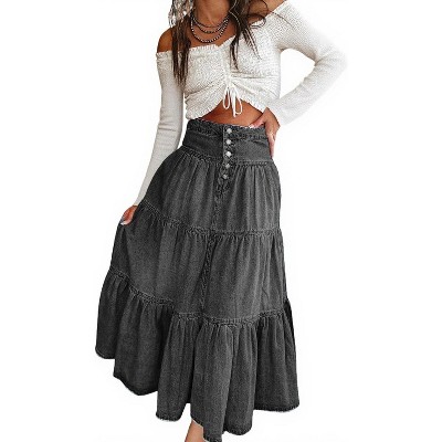 - Boho flared ruffle long skirt for women, ruched, ruffle hem, A line, low waist, bow front decor, coquette, chic and comfy, plain color, layered, summer casual skirt