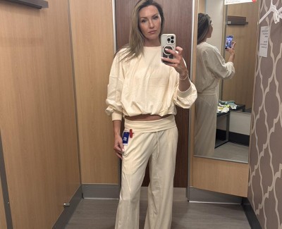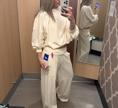 I absolutely love this top! For size reference, I typically wear a small, and while the small looked really cute, I opted for a size large instead, because I really love the way that it draped, but also still felt cropped without feeling baggy and oversized in the arms. I paired it with the fold over lounge pants which Truly this lounge that has got to be one of my favorite that I purchased in many years. It’s just so flattering and the color really brings out the natural tan in the skin. I’ll post a picture for reference with a medium size pants and a size large top. Target absolutely hit this one out of the park love it.