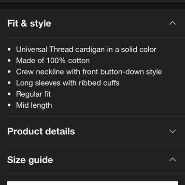 One of my favorite sweaters I've ever purchased. Fits great and such a great length's. The fabric covered buttons are a nice addition. Adds style! Purchased in three colors I loved so much.