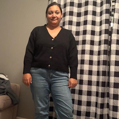 [This review was collected as part of a promotion.] This cardigan is a great staple to have in your wardrobe. The material is thick and the fit is true to size in most aspects. I found the length to be more on the cropped side as it hit above my hip bones, and I generally do not care for that in a cardigan. the buttons are really cute and added great pop of detail however they are sewn on extremely loose and they appear flappy when wearing, and I fear that they will come undone pretty easily