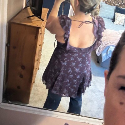 Crepe mini dress from Wild Fable™ with an empire waist and layered hem. Features a V-neck front with behind-the-neck tie and a plunging U-back with ruffle accents. Made from extra-lightweight recycled polyester with full lining for all-day comfortable wear.