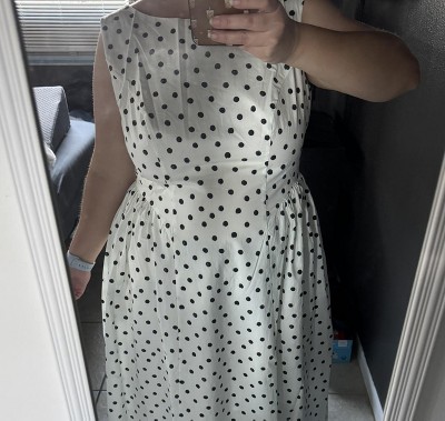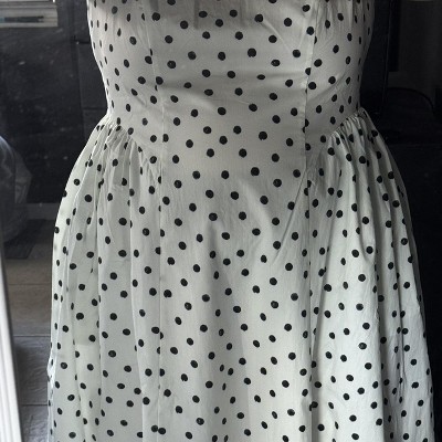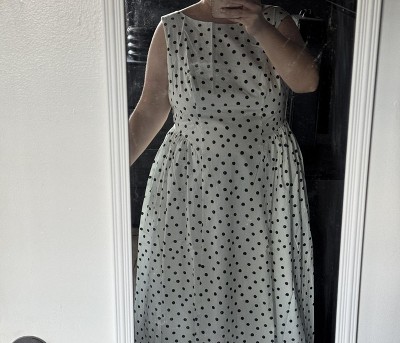 This dress channels Renaissance elegance with a modern twist. The sculpted bodice and flared skirt echo classical silhouettes, while the polka dots add playful precision. A timeless tribute to curves and couture.