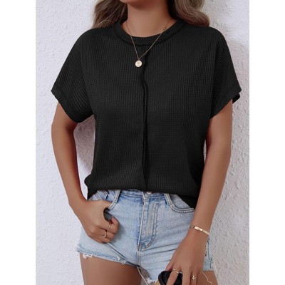 Women's Casual Henley Short Sleeve Ribbed Top with Contrast Trim,M,Black