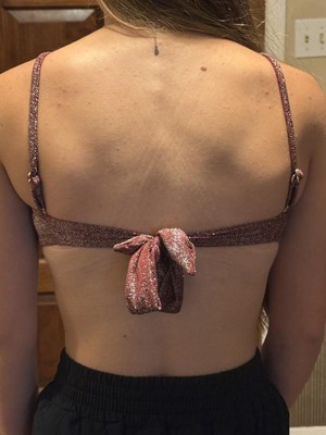 [This review was collected as part of a promotion.] This is a cute, sparkly bandeau bikini top. For reference, I am between a size medium and large. I went with a size medium and I feel it fits true to size. What’s nice about this top is that the back is a tie, so it can be easily adjusted. This bikini top has a decent amount of padding. The fabric of the top is actually not itchy at all, the fabric is actually fairly smooth. I received an incentive to write this review.