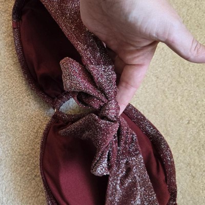 Super cute bathing suit top. This is a stretch, dark red fabric with an oval cut out in the center and glitter sparkles througout. Its super adorable ans very comfortable to wear. It fits true to size and completely adjustable by the strap.