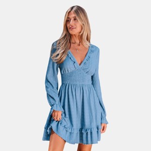Step into summer sophistication with this dreamy dusty blue mini dress, where romantic ruffles and a flattering smocked waist create the ultimate blend of style and comfort. The plunging neckline, long sleeves, and mini length make it perfect for weekend outings or casual days out. Product code: CAA05A5J025SS
