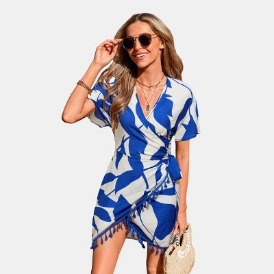 Elevate your warm-weather style with this chic geometric print wrap dress. Crafted from lightweight fabric, it features a flattering v-neckline, short flutter sleeves, and a self-tie waist for a defined silhouette. The tassel trim along the asymmetrical hem adds a playful touch. Effortlessly transition from day to night in this versatile and eye-catching dress. Product code: CAA07B5D054AC,CAA07B5D054TC