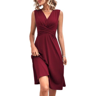 Women's Chic V-Neck Sleeveless Midi Dress, Waist Cross Ruched A-Line Dress Wine red XL