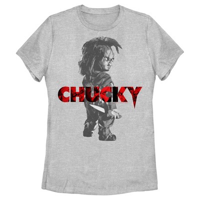 Celebrate your love for the cult-classic slasher film series Child's Play, and watch along as Chucky, the serial killer turned doll, wreaks havoc with new officially licensed apparel from Chucky! This Women's Chucky Black and White Portrait Graphic T-shirt features a large graphic of Chucky holding his knife in black and white, along with his name in red filled in with a collage of menacing Chucky faces across the front. Grab some fun new Chucky apparel this Halloween and celebrate in horror movie style this year!