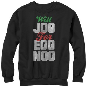 After a brisk winter-time run, treat yourself to a sweet cup of egg nog and the Chin Up Christmas Jog for Egg Nog Black Sweatshirt! This cute black holiday sweatshirt reads "Will Jog for Egg Nog" in a cute distressed print.