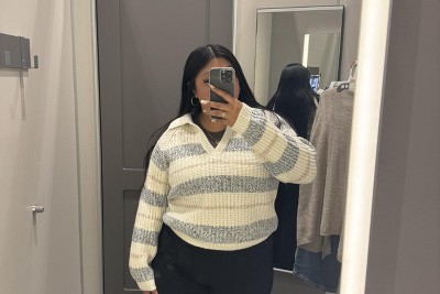 I purchased the white/navy version in size L. I am broad shouldered with big boobs so I sometimes go up in size to XL, which I wish I would have done. It’s cropped too. The sweater is both scratchy and soft if that makes any sense. I hope it doesn’t shrink. But it is nice!