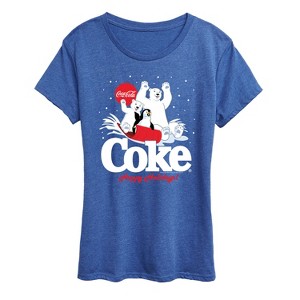 Women's Coca-Cola Happy Holidays Sledding- Women's Short Sleeve Graphic T-Shirt Short Sleeve Graphic T-Shirt - Heather Royal Blue - Small