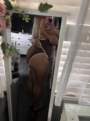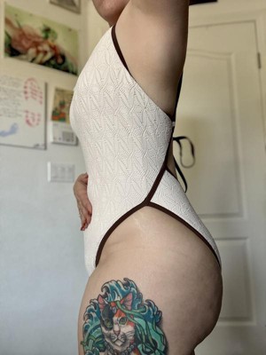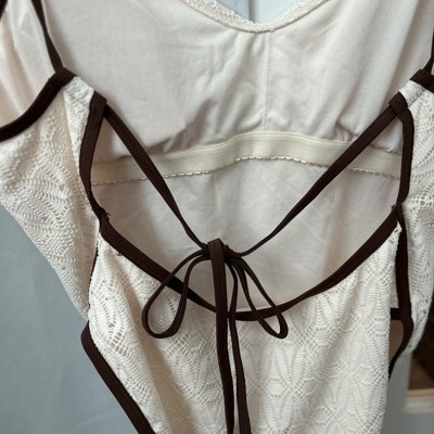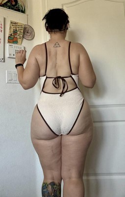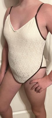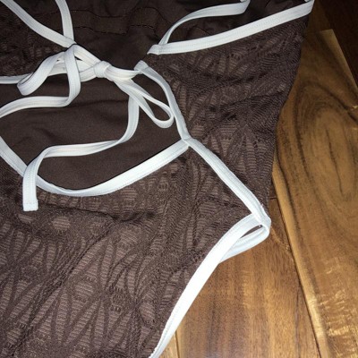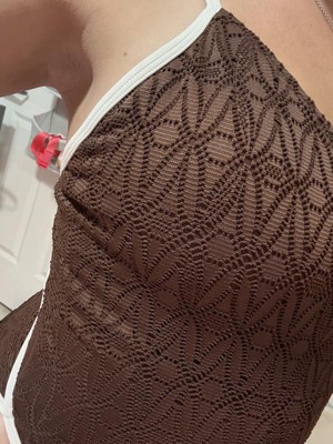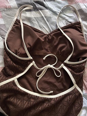 I thought I would love the Women's Contrast Binding Crochet Overlay Extra High Leg Extra Cheeky One Piece Swimsuit by Wild Fable™ swimsuit, and I do! If you like cheeky, this one is for you! I don’t typically choose brown, but the overlay has a nice lace detail! I would size up if you are heavier on the bottom. I will say, it was challenging to tie the back alone. There is a little push up on the top, and snatches in the right places!