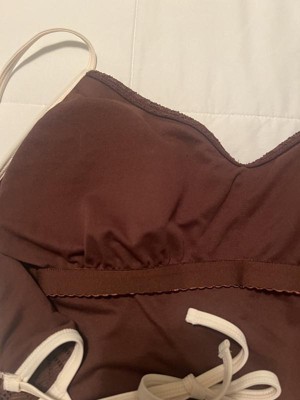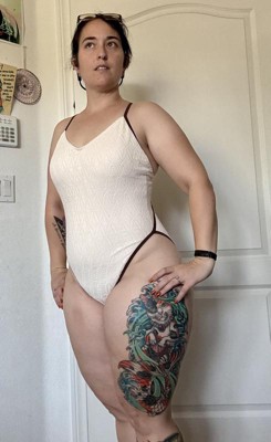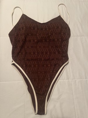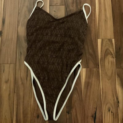 This bathing suit is super high cut with minimal booty coverage. I have a longer torso so it’s especially high cut from being stretched long ways. The bathing suit itself is cute and I like the cream contrast edge with the brown suit. I wish it fit better, but just doesn’t work for my body.