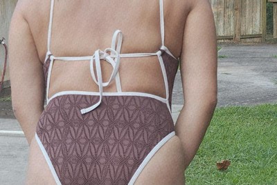 Beautiful suit! I usually go for full coverage swimsuits but this was extremely flattering and still moderately covered behind. I love the pattern and lace look of the fabric. The color is gorgeous as well. The tie strings in the back are dainty and love the area they sit on the body.