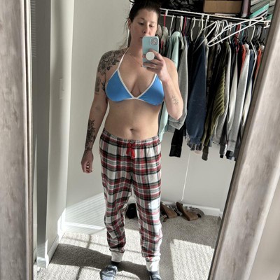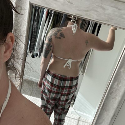 Solid-color triangle bikini top from Wild Fable™ with a halter-neck design. Soft and stretchy fabric with full lining adds comfort, while contrast binding elevates the look. Back and behind-the-neck tie offer a secure fit. Removable cups provide customizable coverage. Sizes X-3X features fully adjustable x-back and tie closure and additional under-bust support.