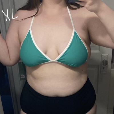 [This review was collected as part of a promotion.] Triangle style bikini top for women. I got this in the blue with white trim color pattern option but it came in other color options as well. I am wearing size large. I am about 5 foot 7 and about 155LB. My bra size is better a 38B and a 38C depending on the brand. I really like how this top fit overall. It covered enough on top but was also flattering at the same time. The string ties were comfortable as well. They were not too tight and did not hurt my neck or back. I received an incentive to write this review.