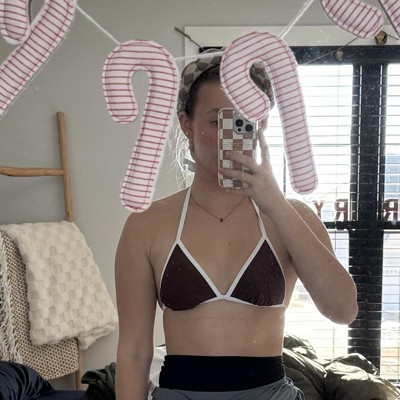 [This review was collected as part of a promotion.] I love this solid color triangle bikini top. It is a halter neck design so you can tie it in the back. I also like that it can be a tighten or loosen. The material is very soft and stretchy as well. I love the contrast colors as they are brown and white. It also has a matching bottom as well which I love. I would say to shoot a size as I am wearing a size small. I would highly recommend this. I received an incentive to write this review.