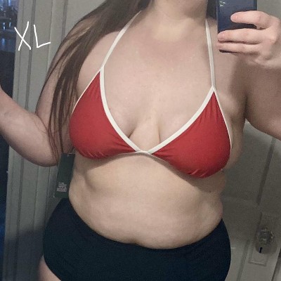 I min triangle halter top is cut is for the smaller chested. I’m a smaller cup and I was spilling out of it. I’m not sure if this is a junior size triangle top or if this is just the way it’s made, but definitely not for this petite woman with an average body type. I was surprised that this didn’t sit in the right places. I wished it had worked out but it didn’t this time. :( overall I love the red!