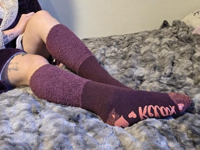 [This review was collected as part of a promotion.] Holy crap. These go all the way to the knee almost and will have you wanting to be infront of a fire with a book. Or chasing your kid around BUT with warm and stretchy socks that have grippy bottoms! The color just makes these even better!!!