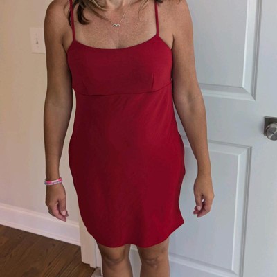 [This review was collected as part of a promotion.] I purchased this dress online in size small. My normal size is 4-6 and this dress fit true to size. I love the red color it is vibrant and really pops. The cut is simple but flattering on. The fabric is lightweight with a nice stretch, making it easy to move around in and very comfortable for all-day wear. I like that the straps are adjustable so you can get the right fit on top. The only thing I don't like is it does run a little short, I really only noticed it if I had to bend down. The fit through the waist and hips is fairly straight, which gives it a sleek look but doesn’t have a lot of shaping. I received an incentive to write this review.