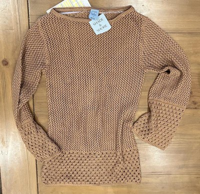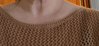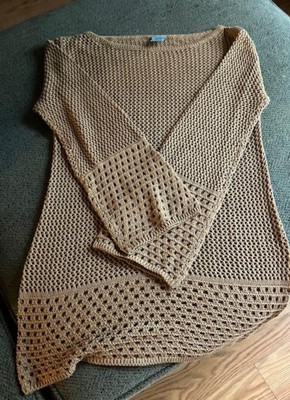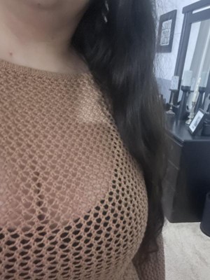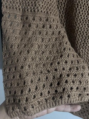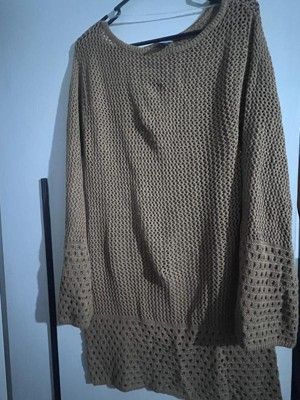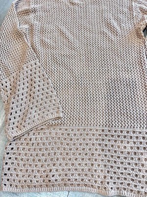 This is a really cute swimsuit coverup that’s a crocheted brown material with pretty bell sleeves . This coverup definitely hugs the curves. I’m 5’5” tall and 160 lbs and wear a 12. I got this in a Large and it doesn’t fully cover my bottom. I would recommend sizing up on this one. Nice and airy, perfect for by the pool.