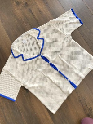 This is perfect cover up for swimming or even just as a crochet shirt with a bra top underneath during the summer. Super cute with the blue piped edges. It’s more of a relaxed box fit, which it’s perfect for hot weather.