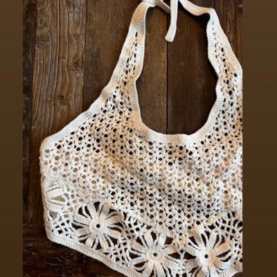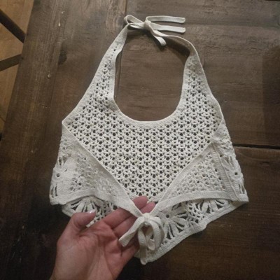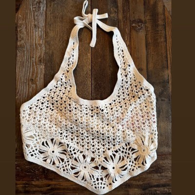 [This review was collected as part of a promotion.] I purchased this women's crocheted top online for an in-store pickup. This adorable cream colored crocheted top is perfect for a concert or any music festival. It's a handkerchief style with a point in the front and an open back with a halter tie neck. This top will need to be worn with a bikini or some type of undergarment underneath because it is very see through. The crochet pattern is pretty though and looks almost handmade. I purchased a size small and it fits true to size. I am typically an xs to small in tops and it's fine. I wear a 34b and have a 16" waist for reference. The price is reasonable and there are even matching shorts sold separately. Great buy!