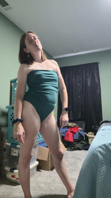 I love that this swimsuit looks fabulous on a variety of body types. The green color is rich and flattering. The suit has some gathered fabric around the waist, which hides potential trouble areas. The gatherers aren’t like full on pleats, they are very minimal It can be worn with or without straps and stays up well. I did not find it to be super high cut or cheeky at all. It has a pretty modest look.