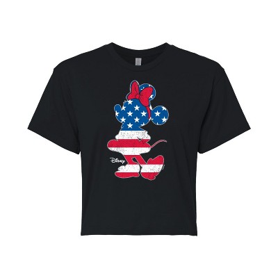 Disney - Americana - Minnie Flag Pattern - Juniors Cropped Cotton Blend T-Shirt - Add a touch of magic to your wardrobe with this graphic apparel featuring iconic Disney designs. Showcasing beloved characters and classic imagery, each piece combines nostalgic charm with modern style—perfect for Disney fans of all ages. Whether you're headed to the parks or just adding whimsy to your everyday look, these graphics bring the magic to life.