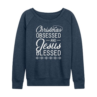 Women's Disney Jack Nice List Lightweight French Terry Wide Neck Long Sleeve Graphic Shirt - Heather Indigo - Medium
