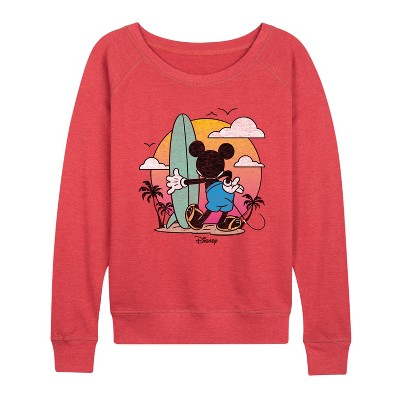 Women's Disney Mickey & Friends Lightweight French Terry Wide Neck Long Sleeve Graphic Shirt - Heather Maroon - Small