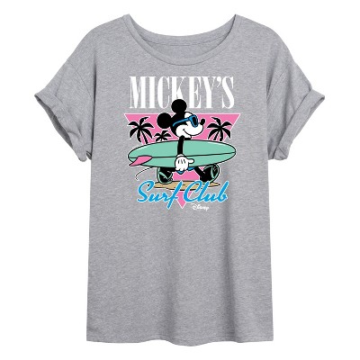 Disney - Mickey & Friends - Mickey's Surf Club - Miami Retro Colors - Women's Short Sleeve Graphic T-Shirt - Add a touch of magic to your wardrobe with this graphic apparel featuring iconic Disney designs. Showcasing beloved characters and classic imagery, each piece combines nostalgic charm with modern style—perfect for Disney fans of all ages. Whether you're headed to the parks or just adding whimsy to your everyday look, these graphics bring the magic to life.